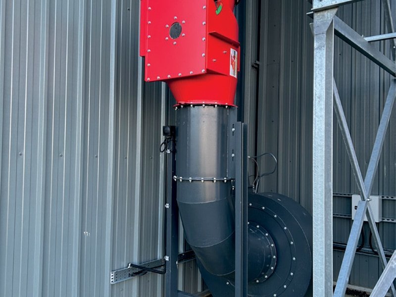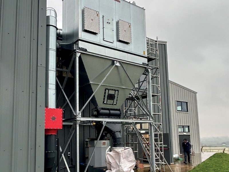 Dustraction installed one of its Dustrax 4 Section No.27RV series filters. This is a tubular bag-type filtering/system, complete with an automatic shaker mechanism designed to handle an air volume of 12000 m³/hr. The waste is transferred into the end of the hopper section by the main floor-mounted Dustrax No.33PB DD 22kw ATEX fan set with the waste being discharged through the heavy-duty rotary valve air seal directly into a briquette or, alternatively, into a bulker bag. Both are fitted with high level indicators to switch automatically when the waste has built up below the rotary valve air seal. The briquettes produced are used in-house on hand-fired heaters, reducing both the heating bills and landfill charges.