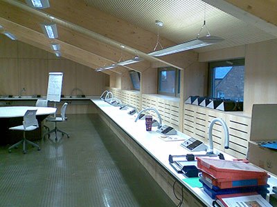 Two large multi-material workshops on the ground floor provide for the traditional processing of wood, metal and plastic and above them are two studios, one dedicated to computer aided design and manufacture and one to electronics, each housing a range of equipment synonymous with contemporary technology, including work stations for 50 personal computers.